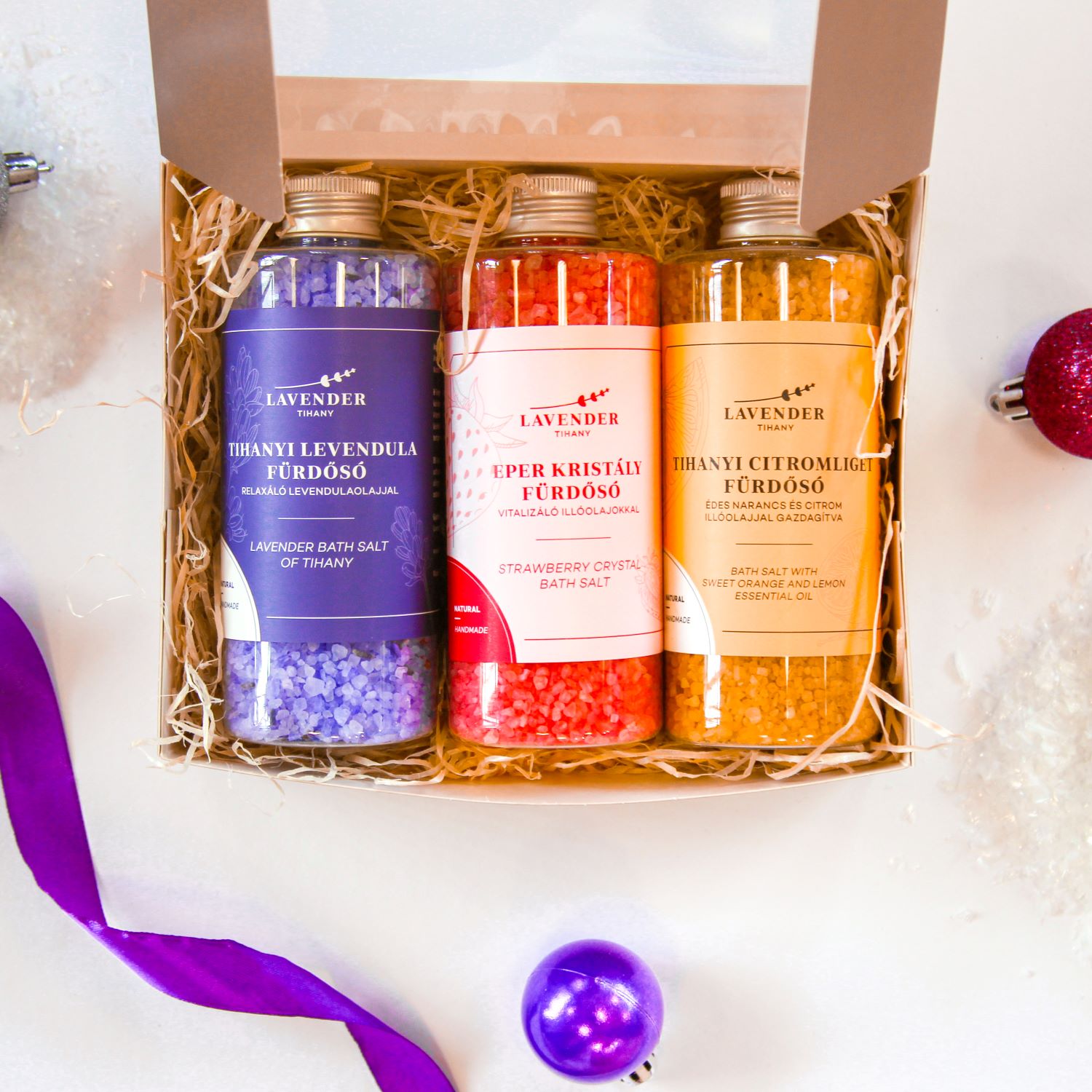 For bathing lovers! Contents of the package: Strawberry Crystal Bath Salt 300 g Tihany Lavender Bath Salt 300 g Tihanyi Lemon Grove Bath Salt 300 g We send it in a gift box so you don’t have to worry about the packaging!