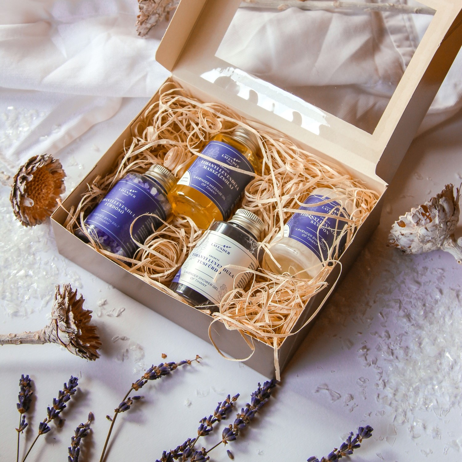 Contents of the package: Tihany Lavender Bath Salt 60 g Tihany Lavender Massage Oil 50 ml Tihany Lavender Shower Bath 50 ml Tihany Lavender Shampoo 50 ml We send it in a gift box so you don’t have to worry about the packaging!
