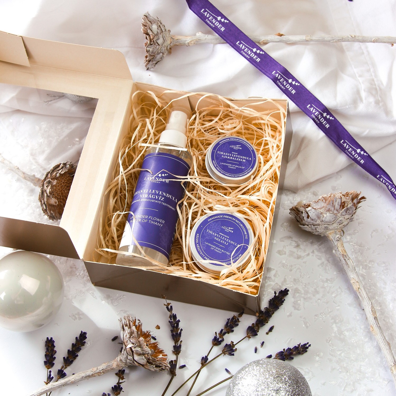 Contents of the package: Tihany Lavender Flower Water 100 ml Tihany Lavender Shea Butter 30 ml Tihany Lavender Lip Balm 15 ml We send it in a gift box so you don’t have to worry about the packaging!