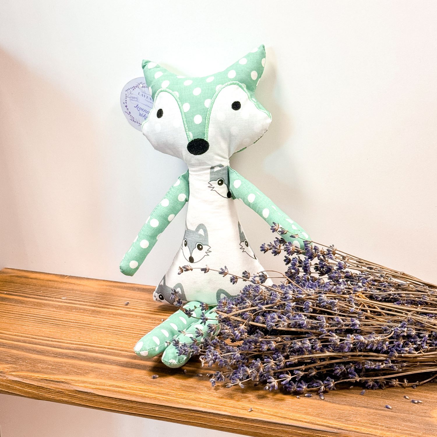 Malonus liesti, raminantis, lapės formos žaislas vaikams. Pagamintas iš lino, medvilnės ir satino. Žaisle įsiūtas levandos žiedas.