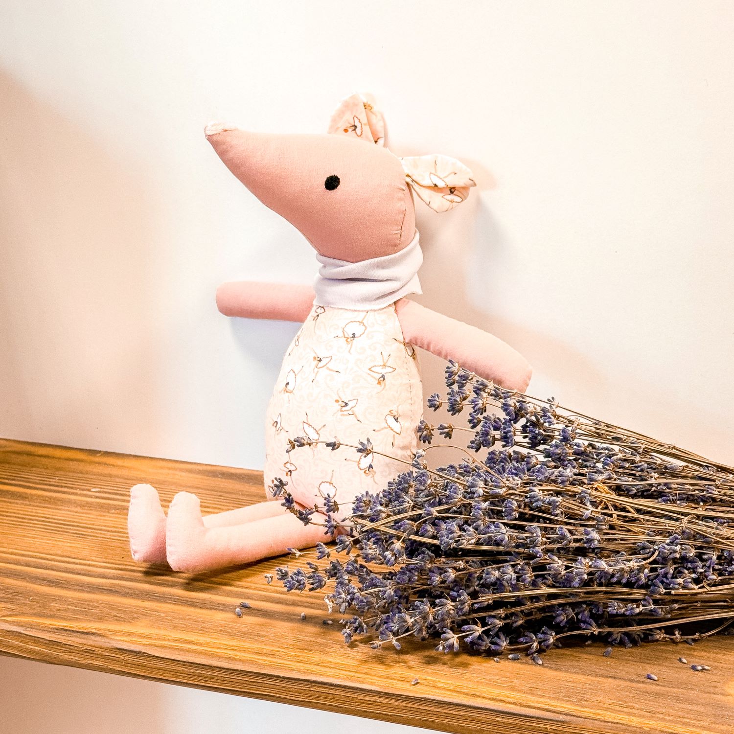 Malonus liesti, raminantis, pelės formos žaislas vaikams. Pagamintas iš lino, medvilnės ir satino. Žaisle įsiūtas levandos žiedas.